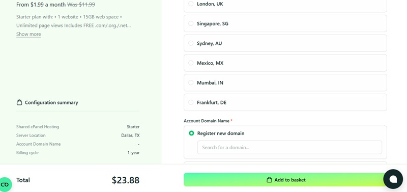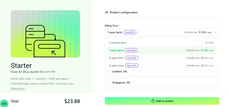 Select your domain. Other extensions such as “.org” are also available but cost more for the first year. Add the domain to your basket. (You can also choose to do this when you add your hosting package.)