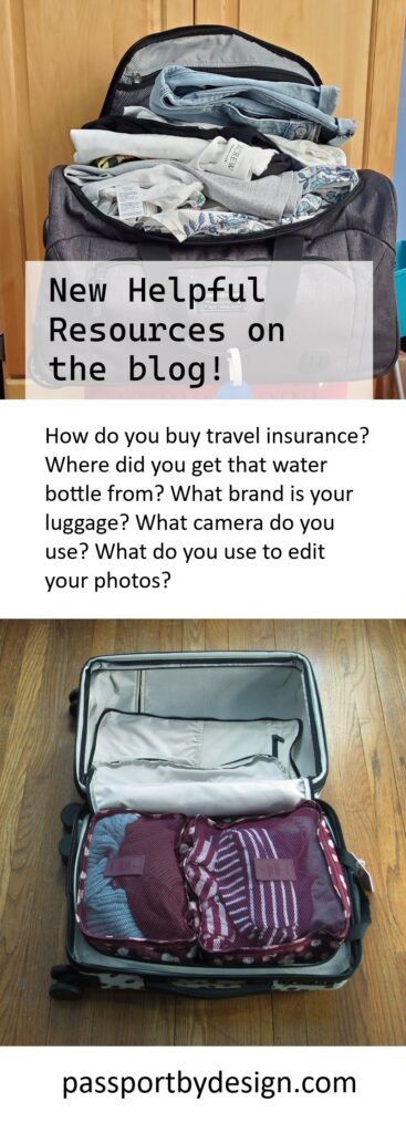 How do you buy travel insurance? Where did you get that water bottle from? What brand is your luggage? What camera do you use? What do you use to edit your photos? Find all the answers in my resource pages. There is an art & design resources page, as well as a travel resources page.